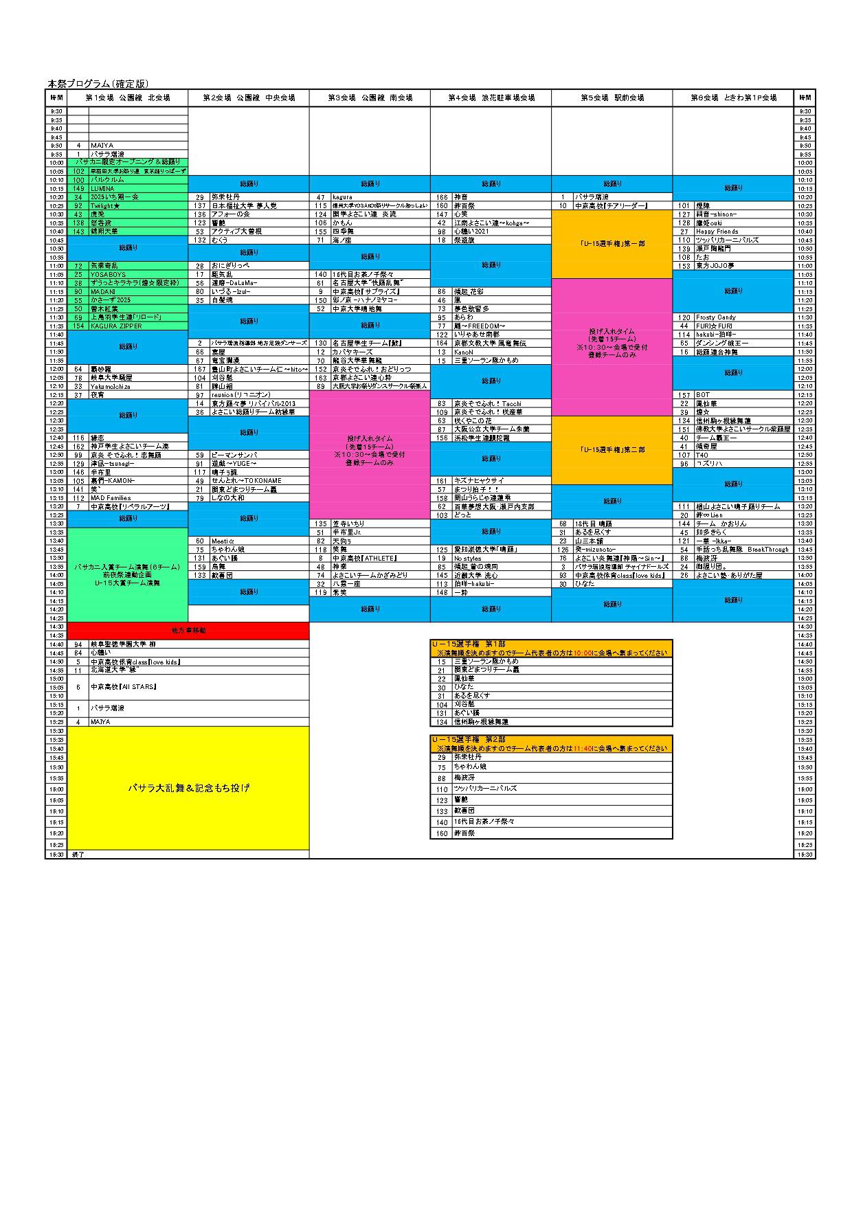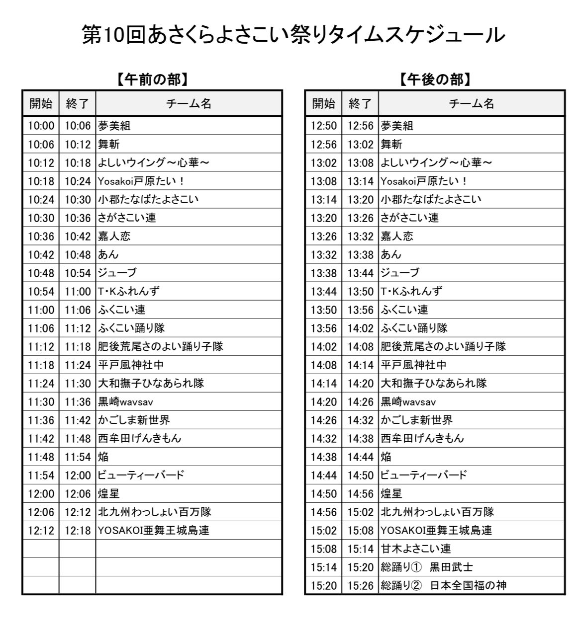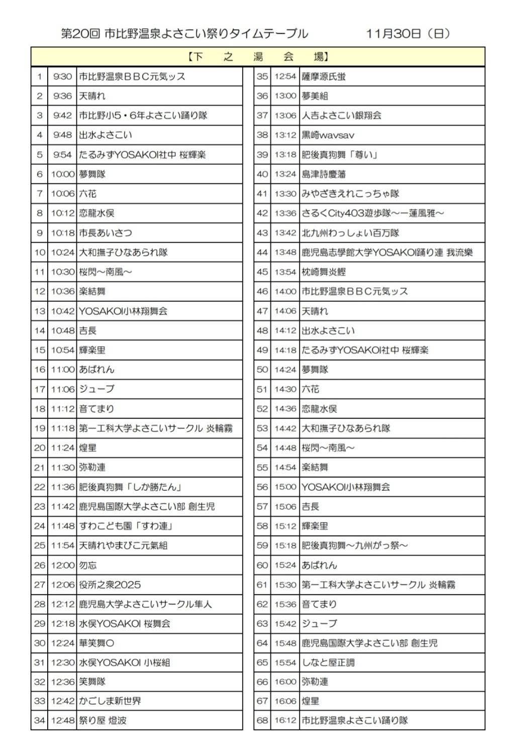 開催予定日: 2025年11月 9日(日) 8:50~16:10 イベント名: YOSAKOI ぶち楽市民祭 2025 開催場所 : 山口県周南市 徳山駅前商店街銀座通り周辺3会場 参考サイト: Yosakoiぶち楽市民祭 Facebook [タイムスケジュール/jpg] |