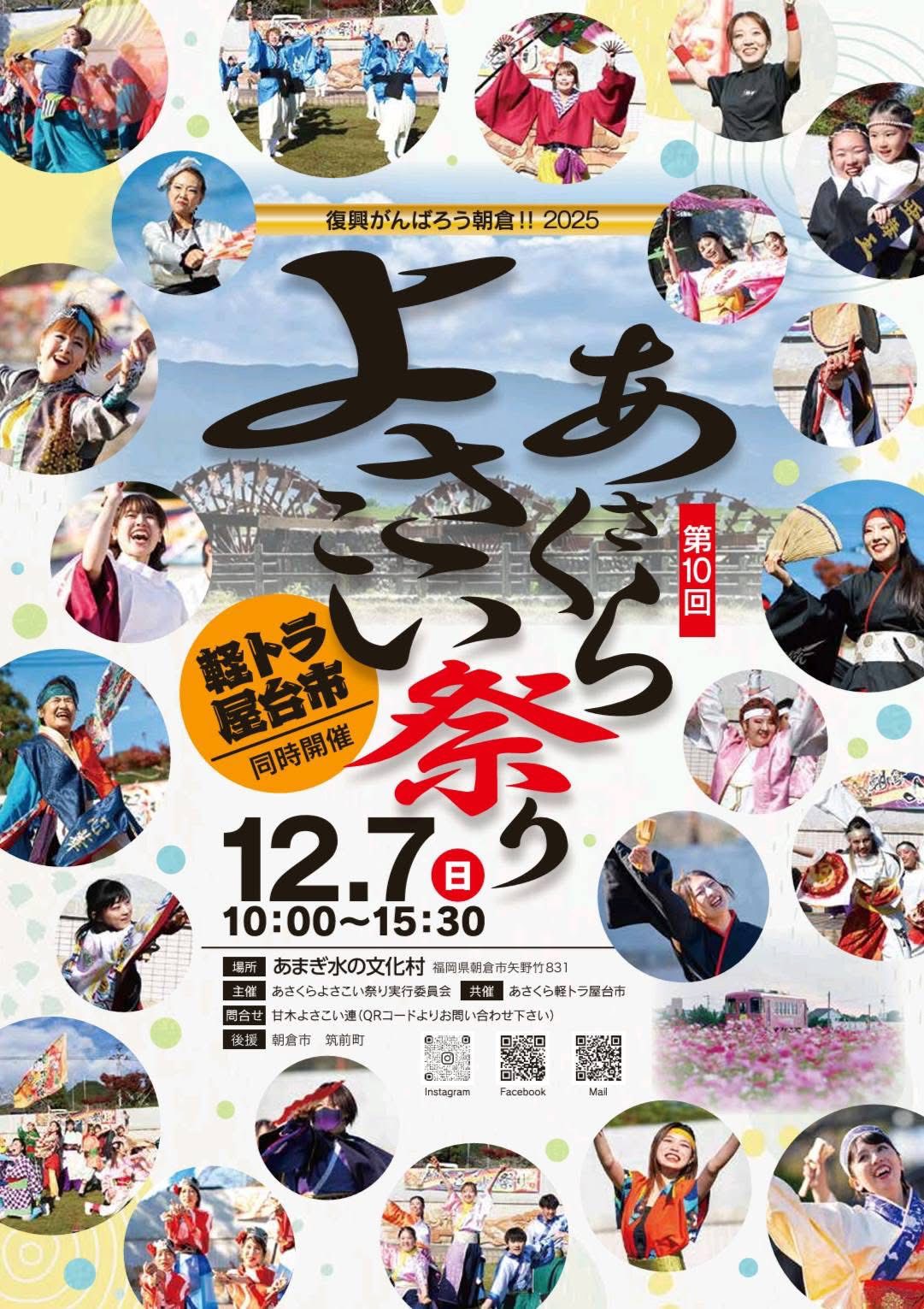 開催予定日: 2025年12月 7日(日) 10:00~15:30 イベント名: 第10回 あさくらよさこい祭 軽トラ屋台市 (復興がんばろう朝倉!! 2025) 開催場所 : 福岡県朝倉市 あまぎ水の文化村 (会場:第1駐車場横の交流広場) 福岡県朝倉市矢野竹831 参考情報 : [ポスター/jpg] [参加チーム/jpg] [タイムスケジュール/jpg] [あまぎ水の文化村パンフ表/jpg] [あまぎ水の文化村パンフ裏/jpg] 備 考 : 入園料、無料。 |
