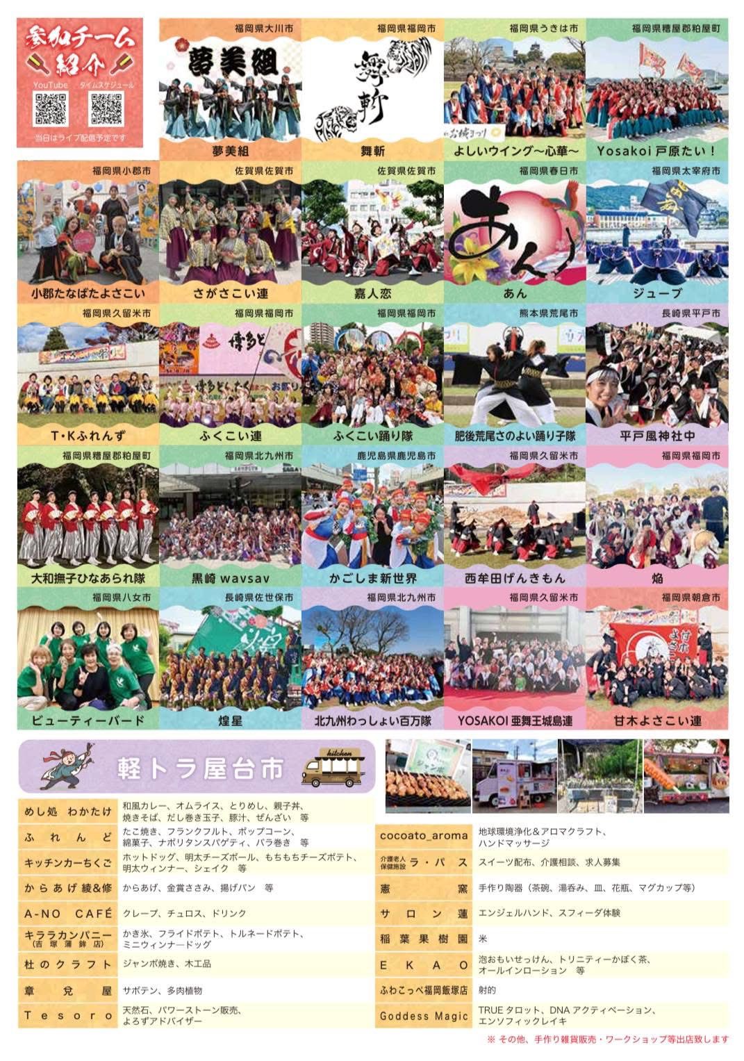 開催予定日: 2025年 9月21日(日) イベント名: わっしょいYOSAKOI北九州 2025 (わっしょい百万夏まつり 2025) 開催場所 : 福岡県北九州市小倉北区 小倉城大手門広場、勝山公園芝生会場、リバーウォーク会場 参考サイト: わっしょい百万夏まつり サイト [わっしょい YOSAKOI 北九州 2025]頁 |