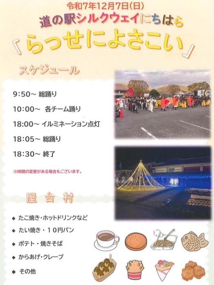 開催予定日: 2025年12月 7日(日) 9:50~18:30 イベント名: らっせによさこい 道の駅シルクウエイにちはら 開催場所 : 島根県鹿足郡津和野町池村 1997-4 参考サイト: シルクウエイにちはら サイト [らっせによさこい 案内] [ポスター/jpg] |
