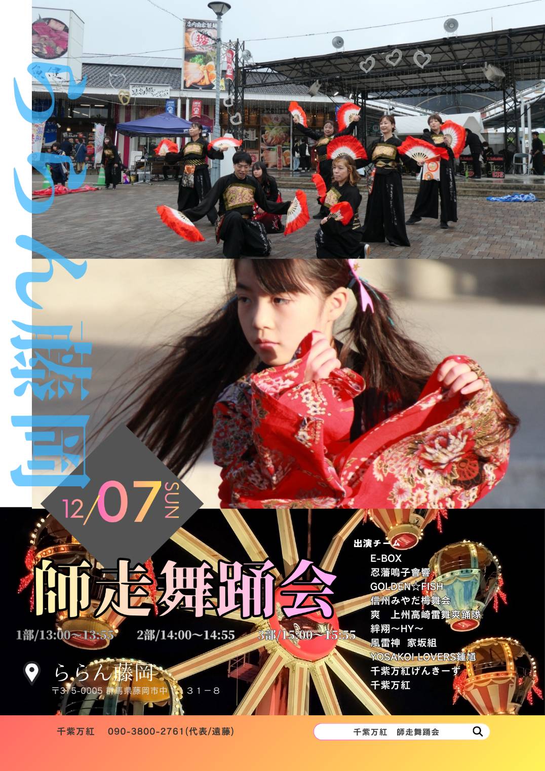 開催予定日: 2025年12月 7日(日) 13:00~、14:00~、15:00~ イベント名: ららん藤岡 師走舞踊会 VOL.3 開催場所 : 群馬県藤岡市 道の駅ららん藤岡 野外ステージ 群馬県藤岡市中1131-8 参考サイト: ダンスチーム千紫万紅 facebook [ポスター/jpg] [タイムスケジュール/jpg] |