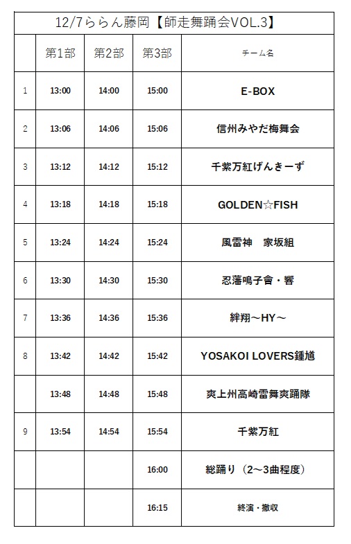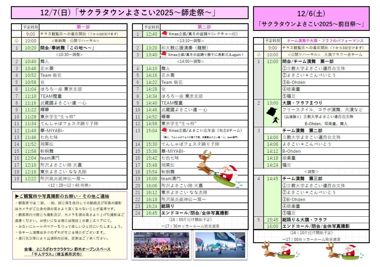 開催予定日: 2025年12月 6日(土)前日祭 12:00~16:00 2025年12月 7日(日)師走祭 10:00~16:45 イベント名: サクラタウンよさこい 2025 ~師走祭~ 開催場所 : 埼玉県所沢市東所沢和田3-31-3 ところざわサクラタウン 千人テラス 最寄り駅 : 武蔵野線 東所沢駅 参考サイト: 舞人 Facebook [12/7,6 よさこい、他 タイスケ/jpg] 備 考 : 12/6 (土) は前日祭、12/7(日) 師走祭/本祭となります。 12/7 (日) 師走祭では、よさこい漣18チームによる よさこい演舞が行われます。 |