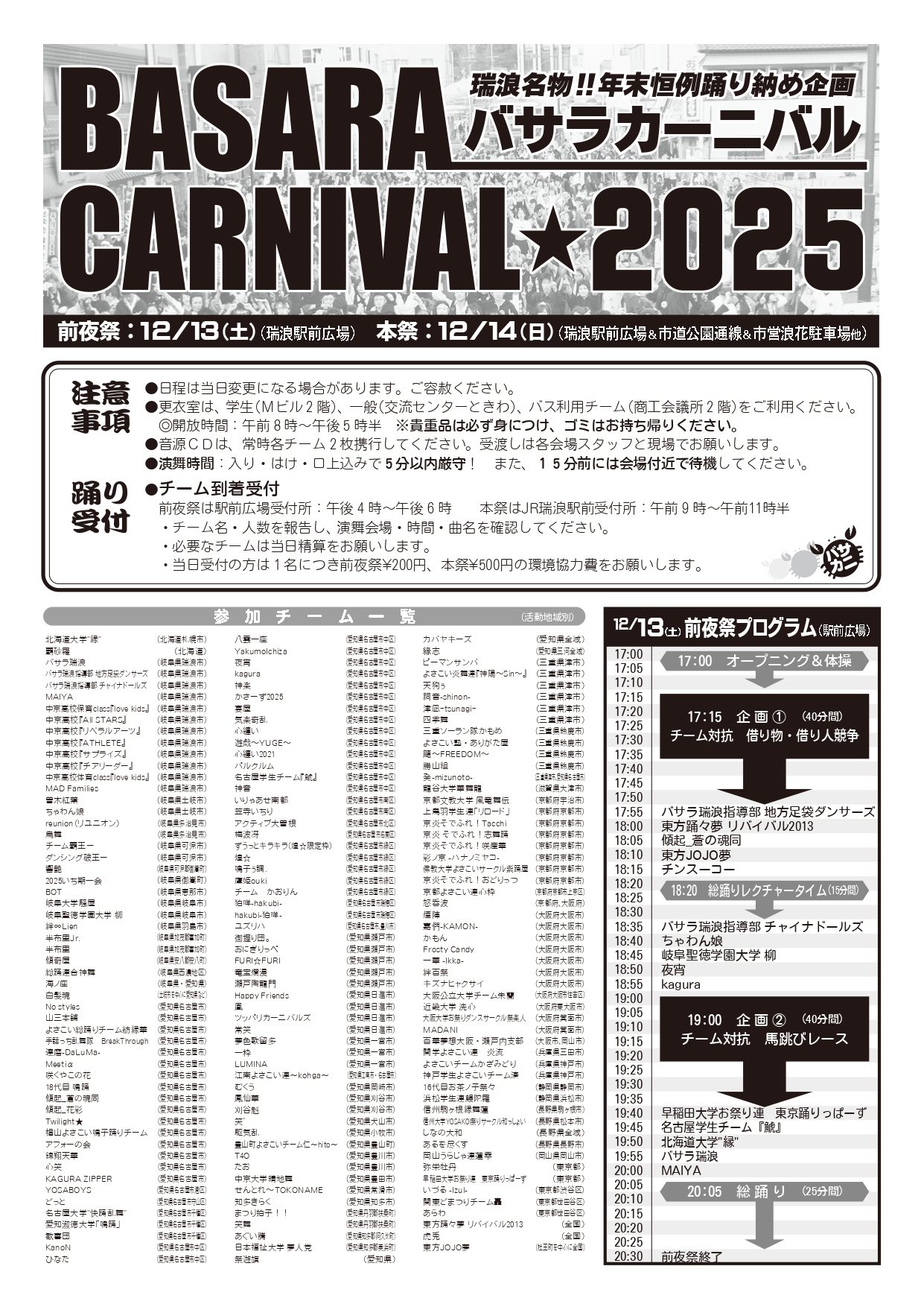 開催予定日: 2025年12月13日(土) 前夜祭 17:00~20:30 2025年12月14日(日) 本 祭 9:30~16:30 イベント名: 第26回 バサラカーニバル 開催場所 : 岐阜県瑞浪市 JR瑞浪駅前周辺市街地 参考サイト: バサラ瑞浪公式 サイト 参考情報 : [ポスター/jpg] [参加チーム/jpg] [12/13 タイムスケジュール/jpg] [12/14 タイムスケジュール/jpg] 備 考 : 今年は178チームが参加予定。 |