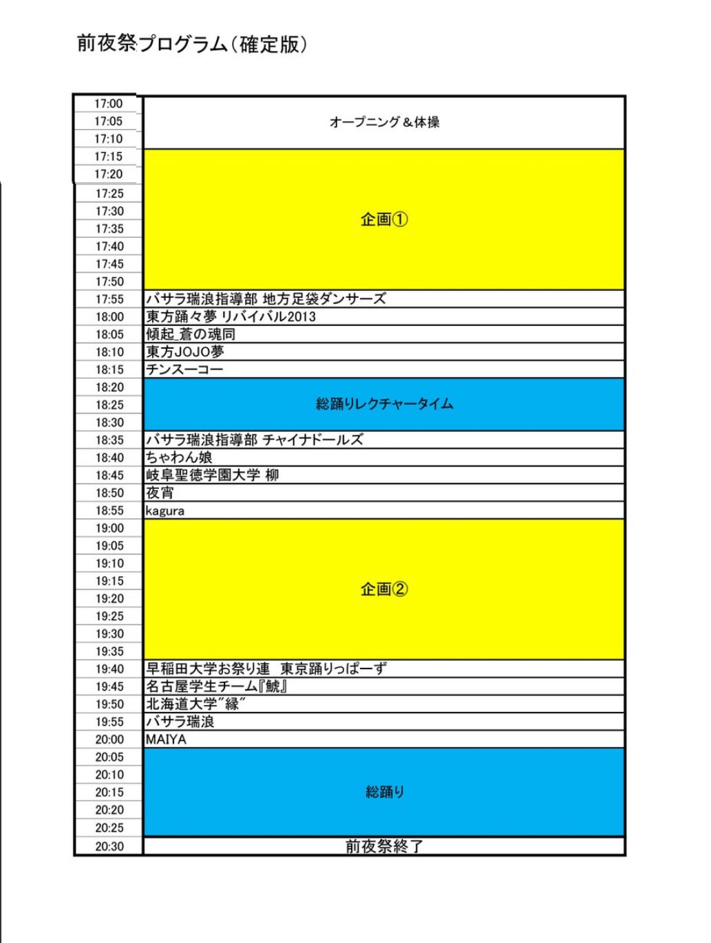 開催予定日: 2025年 8月23日(土) 15:00~16:30 イベント名: 第50回 富士見祭り よさこい 開催場所 : 埼玉県朝霞市 朝霞市役所駐車場 最寄り駅 : 東武東上線 朝霞駅(徒歩約10分) 参考サイト: 溝沼連合町内会『朝霞溝連』 Facebook [ポスター/jpg] [タイムスケジュール/jpg] 備 考 : イベント内によさこい演舞があるイベントです。 例年、朝霞市内の10数チームにより演舞が行われ ます。 今年は12チームが参加予定です。 |