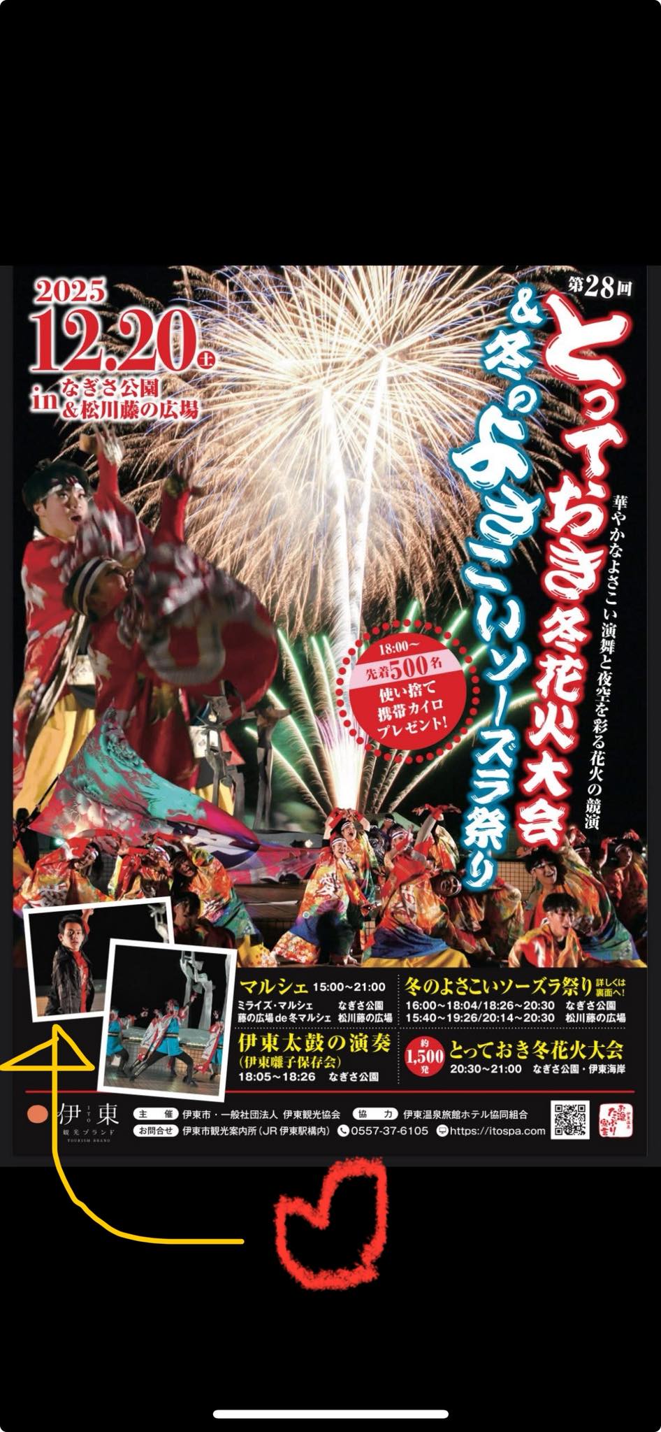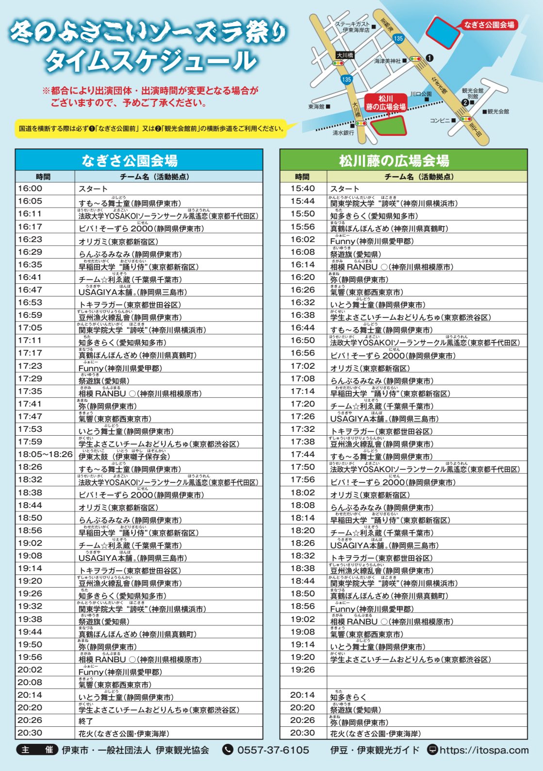 開催予定日: 2025年12月20日(土) イベント名: 第28回 とっておき冬花火大会 & 冬のよさこいソーズラ祭り 開催場所 : 静岡県伊東市東松原178-36 伊東オレンジビーチ 『なぎさ公園』、 及び、松川藤の広場 最寄り駅 : 伊豆急行伊東線 伊東駅 徒歩約10分 参考情報 : [ポスター/jpg] [タイムスケジュール/jpg] Thank's : 弥 代表さま、開催情報ありがとうございました。 |