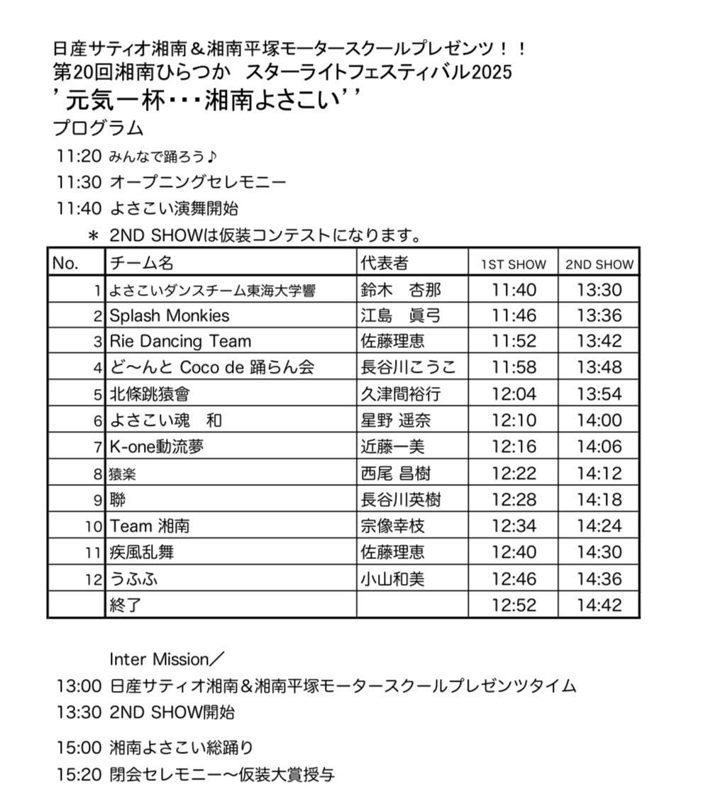 開催予定日: 2025年12月21日(日) 11:20~14:45 イベント名: 湘南ひらつか スターライトフェスティバル 2025 元気一杯!湘南よさこい 開催場所 : 神奈川県平塚市 紅谷町まちかど広場 最寄り駅 : JR東海道線 平塚駅 参考情報 : [スターライトフェスティバル タイスケ/jpg] 備 考 : 湘南ひらつかスターライトフェスティバルのイベント のひとつです。 例年、各チーム2回の演舞が行われます。 2回目の演舞は各チーム趣向を凝らした仮装での演舞 が行われる楽しいイベントです。 今年はよさこい漣を中心に12チームが参加予定です。 Thank's : ムナ先生、詳細情報ありがとうございました。 |